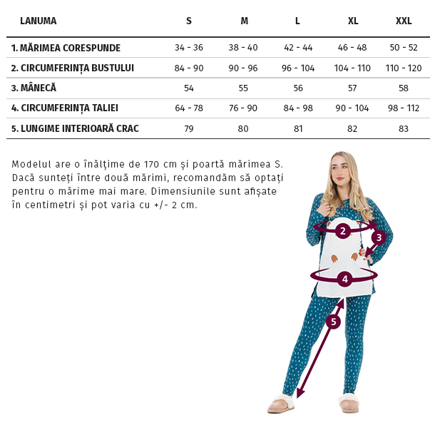 Pijamalele poate fi ușor diferite de modelele prezentate, deoarece imprimeul depinde de croiala materialului.