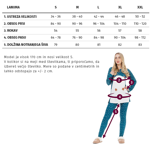 - Pižame lahko pri vzorcih malenkost odstopajo, saj je tisk odvisen od reza materiala
